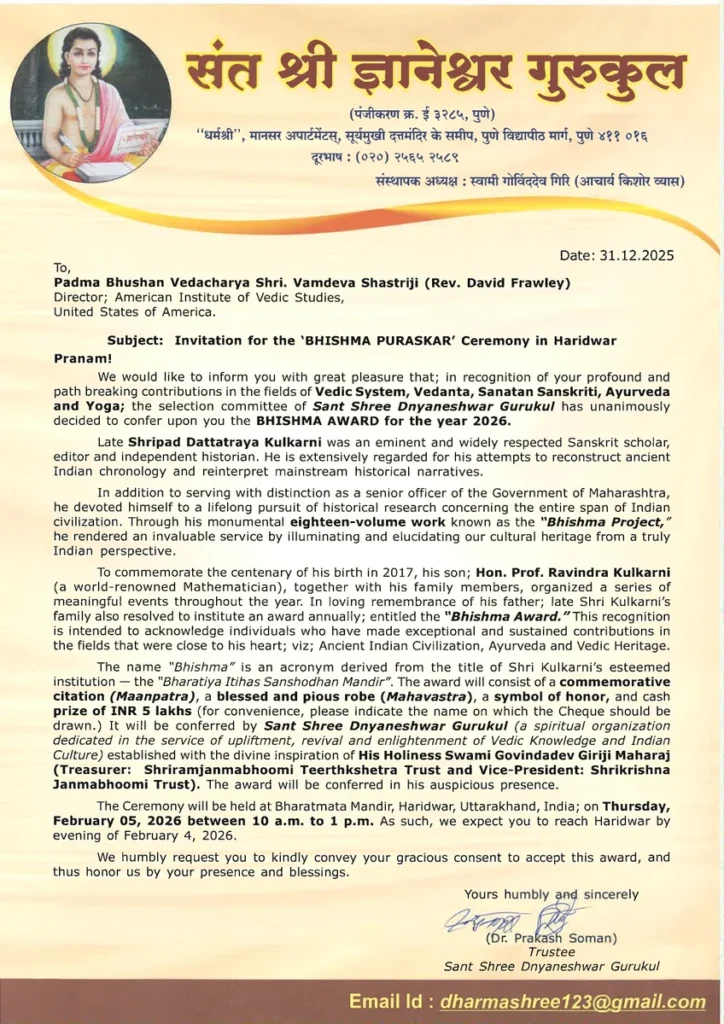 We are proud to share that Vedacharya Dr. David Frawley has been named the recipient of the BHISHMA AWARD for 2026. This distinguished honor is presented by Sant Shree Dnyaneshwar Gurukul, an organization dedicated to the preservation and promotion of Vedic culture under the leadership of His Holiness Swami Govindadev Giriji Maharaj.