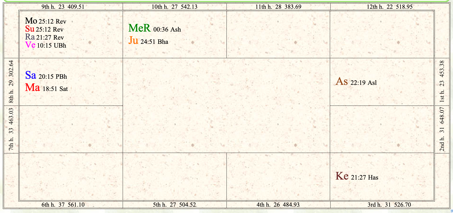NINTH HOUSE: MOON 25:12 PISCES. SUN 25:12 PISCES. RAHU 21: 17 PISCES. VENUS 10:15 PISCES.